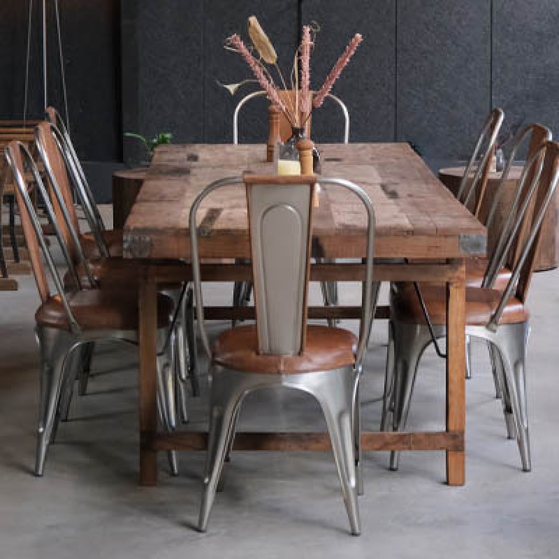 Ένα μεγάλο και μακρύ τραπέζι από ανακυκλωμένο ξύλο με μεταλλική βάση. Με το μέγεθός του και την όμορφη εμφάνισή του, το τραπέζι θα δημιουργήσει μια άν..
